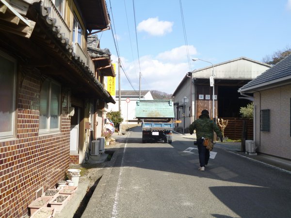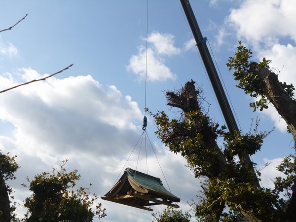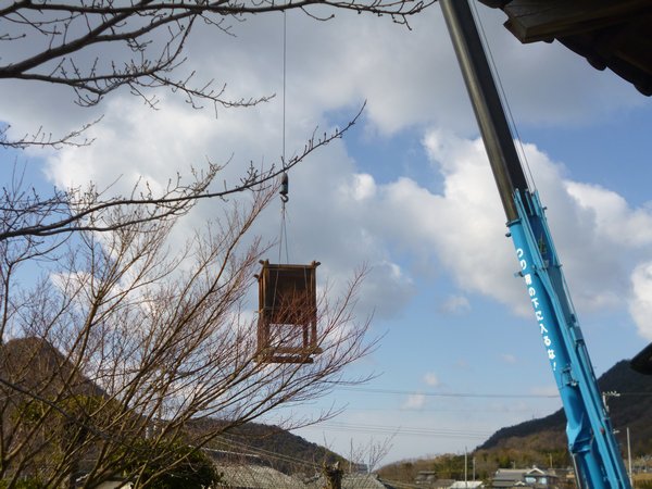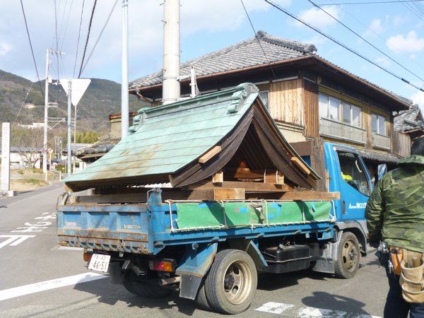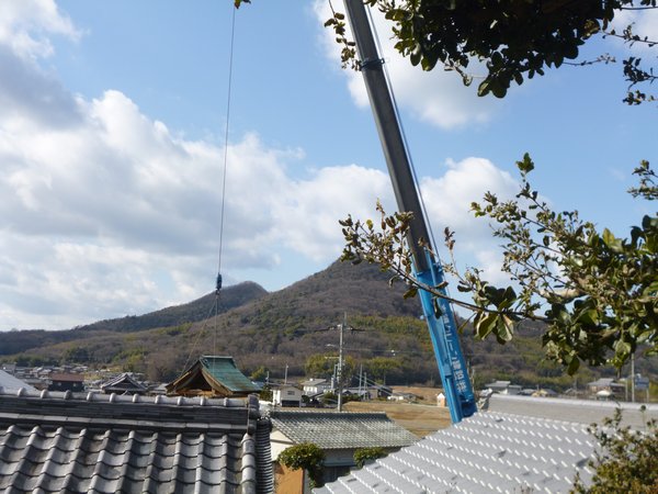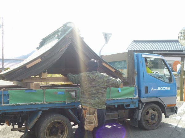 まずはクレーンで屋根だけを吊るしてトラックに乗せました
