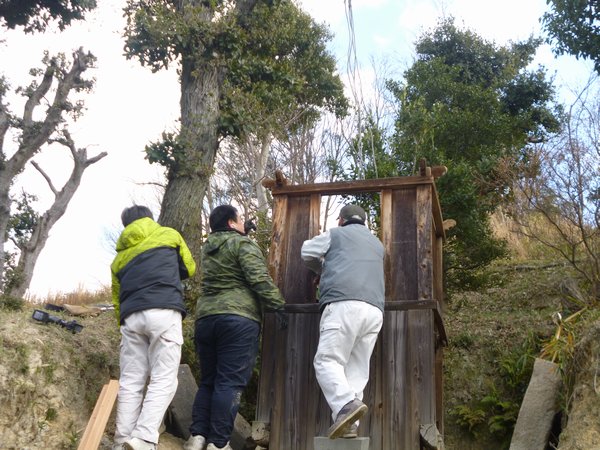 大きなクレーンで吊り上げるので前日からの準備や当日クレーンを置く場所の地面を固めたりしました