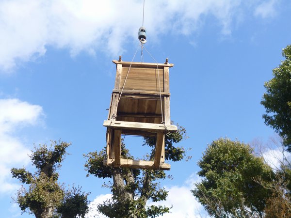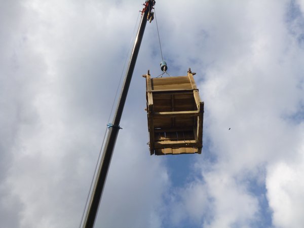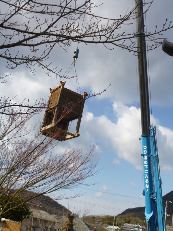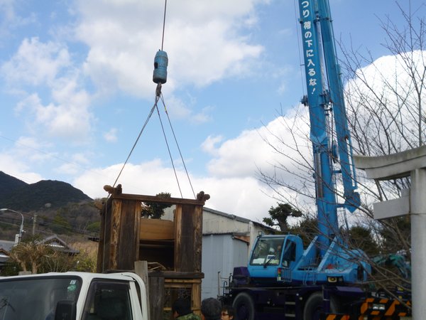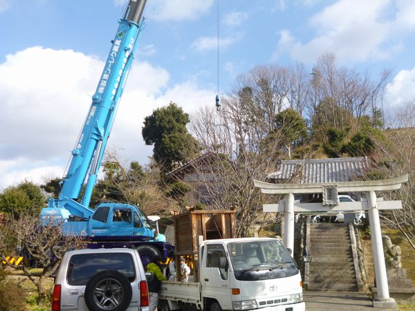 次に土台の脚の部分の四箇所にワイヤーを掛けて吊り上げて移動させトラック に乗せて、作業場まで運びました