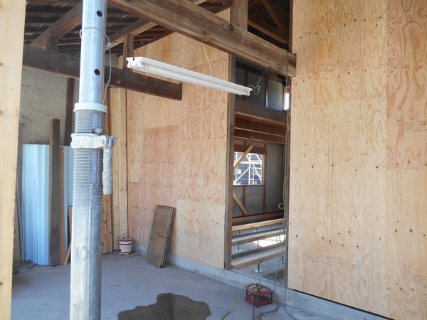 外部のサッシも取り付けられ、防水シートも貼る工事です。