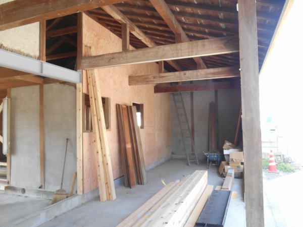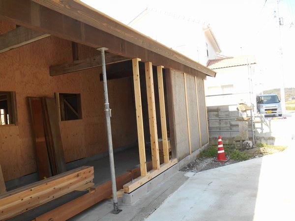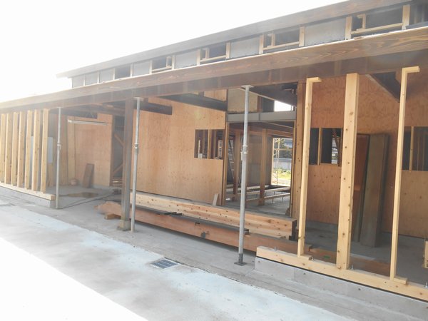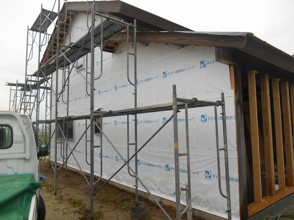 外部のサッシも取り付けられ、防水シートも貼る工事です。
