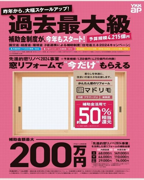 断熱窓、ドアのリフォーム最大200万円補助金制度のお知らせ
